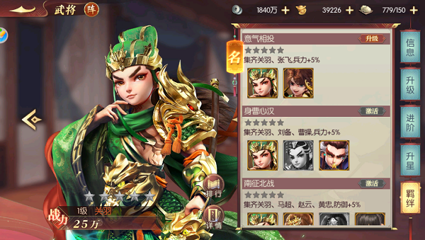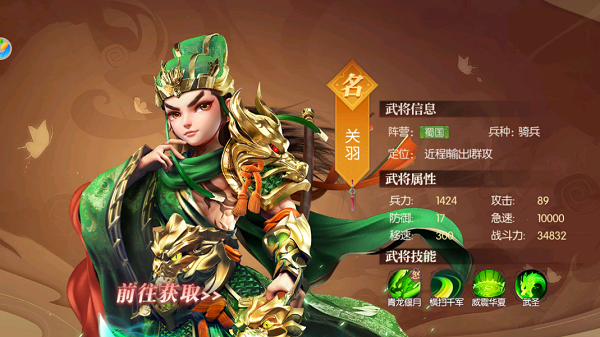 威震华夏:战斗开启之际,关羽会布下桃园阵。处于桃园阵范围内的友军,所受伤害将减少10%,同时还能共同分担承受的伤害。