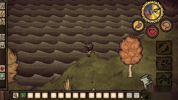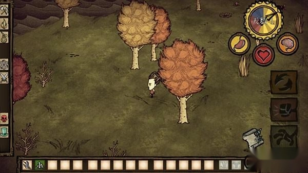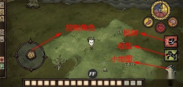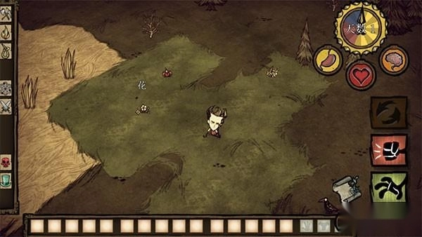 游戏正式开启后,左侧负责操控角色方向,右侧则用于收集物品。玩家需要尽可能收集所有可利用的资源,以此来抵御饥荒的威胁。