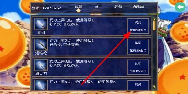 在商店界面挑选对应的武器,消耗金币并点击购买按钮即可获得,这些武器能够提高武将的武力属性。
