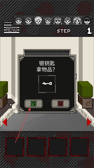 当当前界面弹出银钥匙物品的提示时,点击绿色对勾形状的确认按钮,就能获得这把银钥匙道具,以便在后续关卡中进行互动使用。