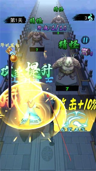 操控角色对关卡里的精怪进行自动攻击,借助攻速加成来快速降低敌人的血量。
