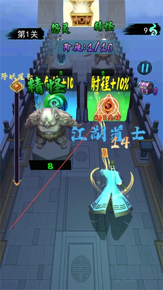不断战胜精怪,可获得攻击提升10%、射程增加10%之类的增益效果,以此推动关卡进程。