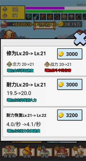 从右侧进入游离界面后,持续点击右下角的仙鹤,待出现一颗蓝色宝石时点击它,即可获得海量收益。