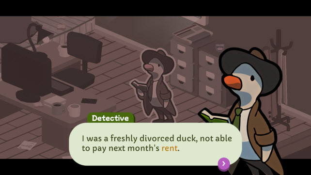 1、极具趣味的侦探解谜游戏模式,玩家将化身鸭子侦探,探寻事件背后的真相。