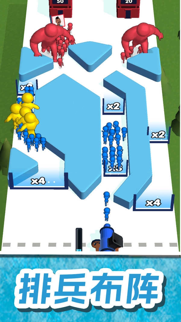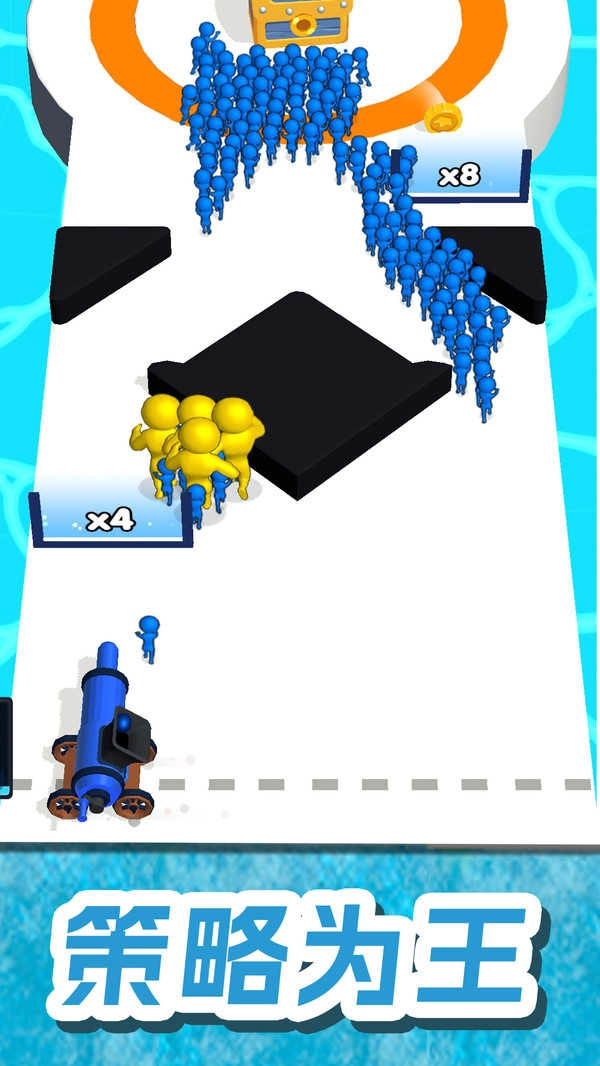 每位玩家都能借助大炮之类的武器发射大量士兵,率领他们向敌人发起进攻以赢得胜利。不过这并非一场普通的行动,而是一次真正的挑战:行动路径上会出现多种形态各异且不断变化的倍增门,助力玩家扩充士兵数量,同时还存在一些会消耗士兵的障碍物,这就要求玩家时刻做出明智的抉择,方可维持领先地位。