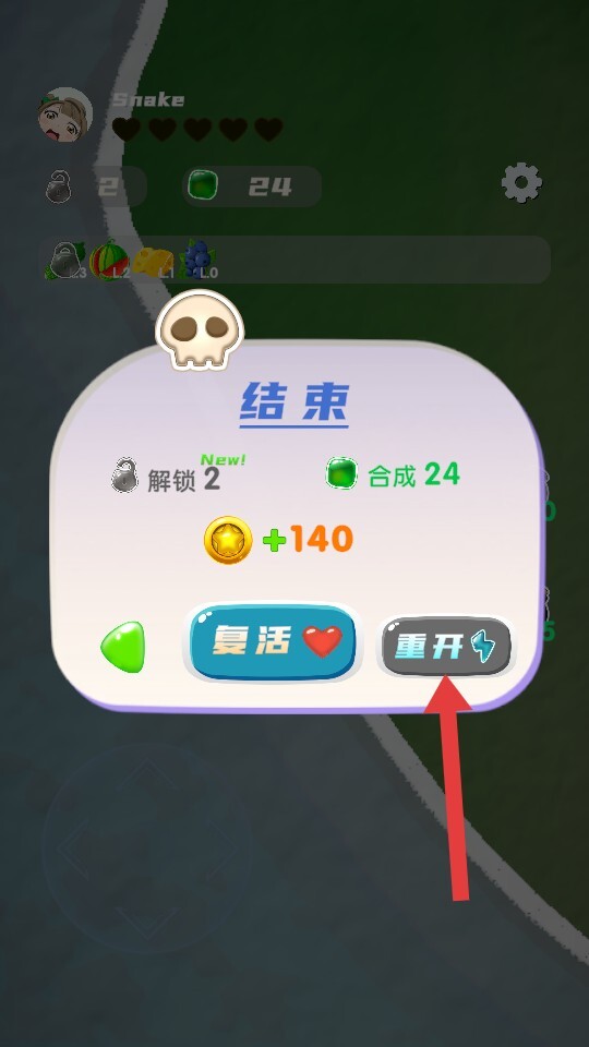 4、游戏结束后会弹出【结束】提示界面,要是想再次挑战,点击红箭头指向的【重开】按钮即可。