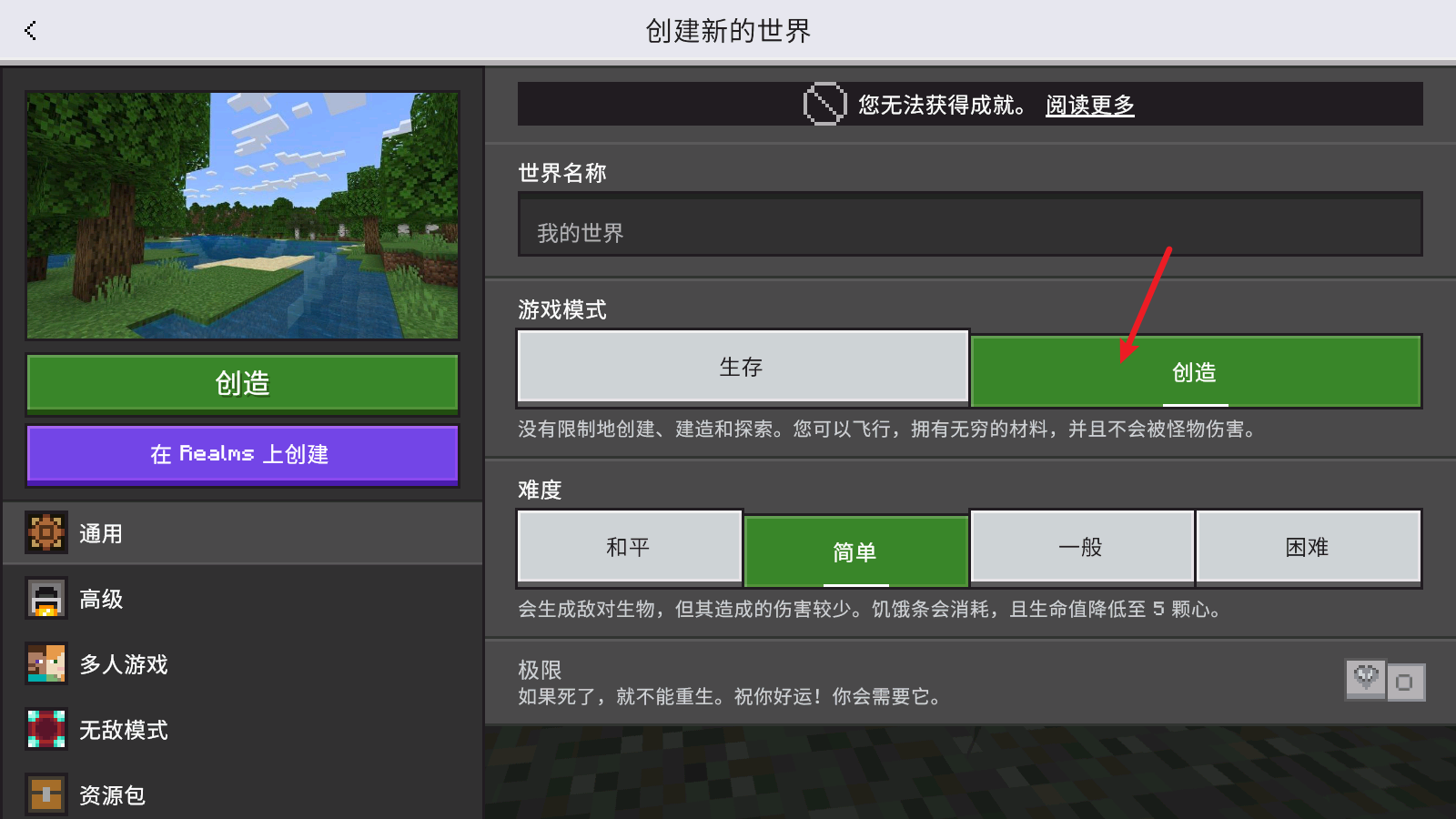 首先要创建一个属于自己的世界,你可以选择生存模式,也可以选择创造模式。