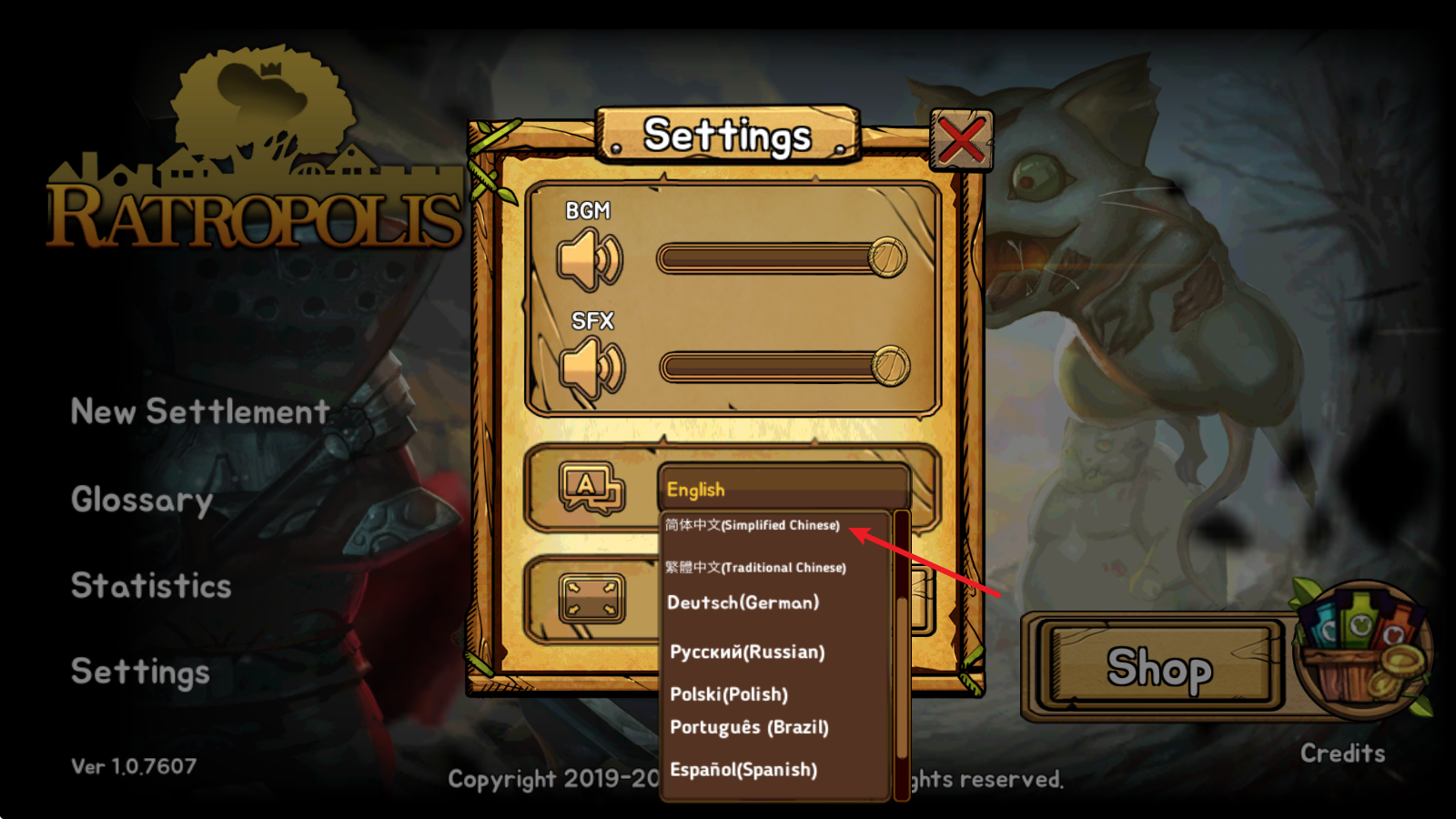 3、在弹出的下拉列表里找到简体中文选项并点击即可。(点击后游戏会自动关闭,并非异常闪退,重新启动游戏就能完成语言切换)