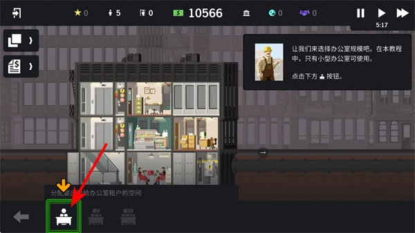 1、在游戏里,点击小型办公室模块是规划办公空间的关键步骤,点击之后就能挑选合适的办公室大小,给租户划分出办公区域。