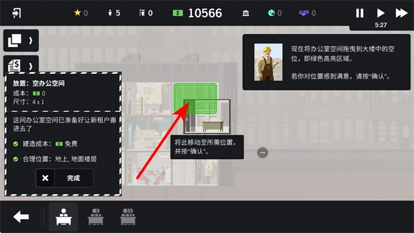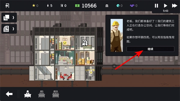 3、点击继续按钮来推进建筑进程,继续操作是完成办公空间建设后的关键步骤,点击该按钮后,即可等待建筑工人完成施工,从而开启新的建筑任务。