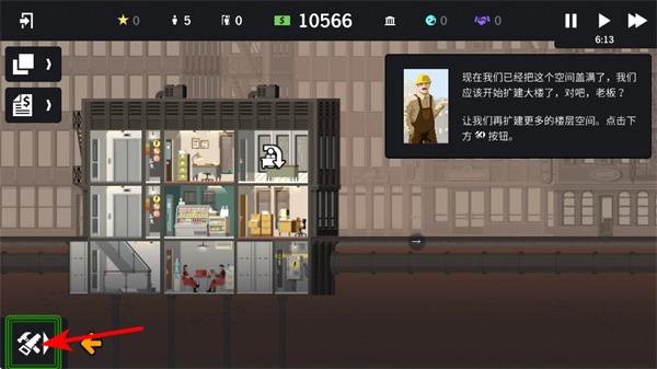 4、点击建筑工具按钮是大楼扩建进程中至关重要的工具选择操作,完成点击后即可进入建筑功能界面,进而开展扩建楼层等相关操作,以此实现空间容量的拓展。