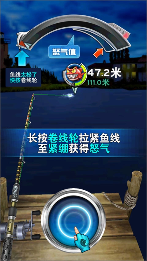 5、长按卷线轮让鱼线处于紧绷状态,以此来积攒怒气值,这种状态对提升钓获成功率是有帮助的。