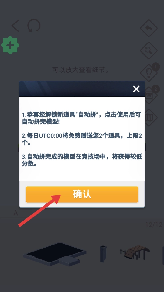 2、点击【确认】按钮,熟悉新道具自动拼的使用规则后,继续进行游戏。