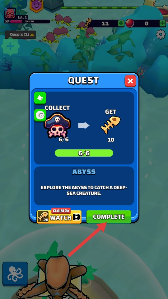 2、完成任务后,点击【COMPLETE】按钮,即可获得鱼骨奖励,助力提升角色实力,从而推进游戏进程。