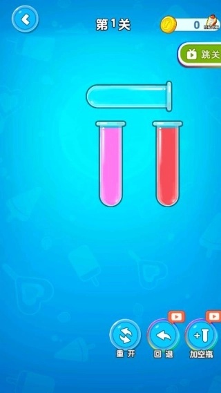 1.点击选择一个瓶子,将其顶部的液体拖拽倒入另一个瓶子,但只能倒入颜色相同且有空余容量的瓶子。