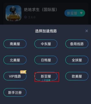 1、安装好和平精英国际服体验服的正版应用后,借助加速工具启动该软件,选择新亚服线路进行加速,随后进入游戏;