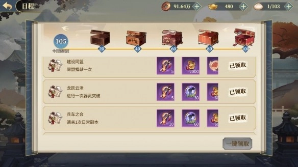最后我们进入“日程”系统,就像下面这张图显示的那样,在完成同盟建设、器灵突破、日常副本这些任务后,也能在这里领取经验奖励。