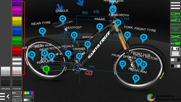 点击右侧第三个按钮后,左侧的一系列自行车配件就会展示出来,我们能够自由选择并对自行车进行改装操作。