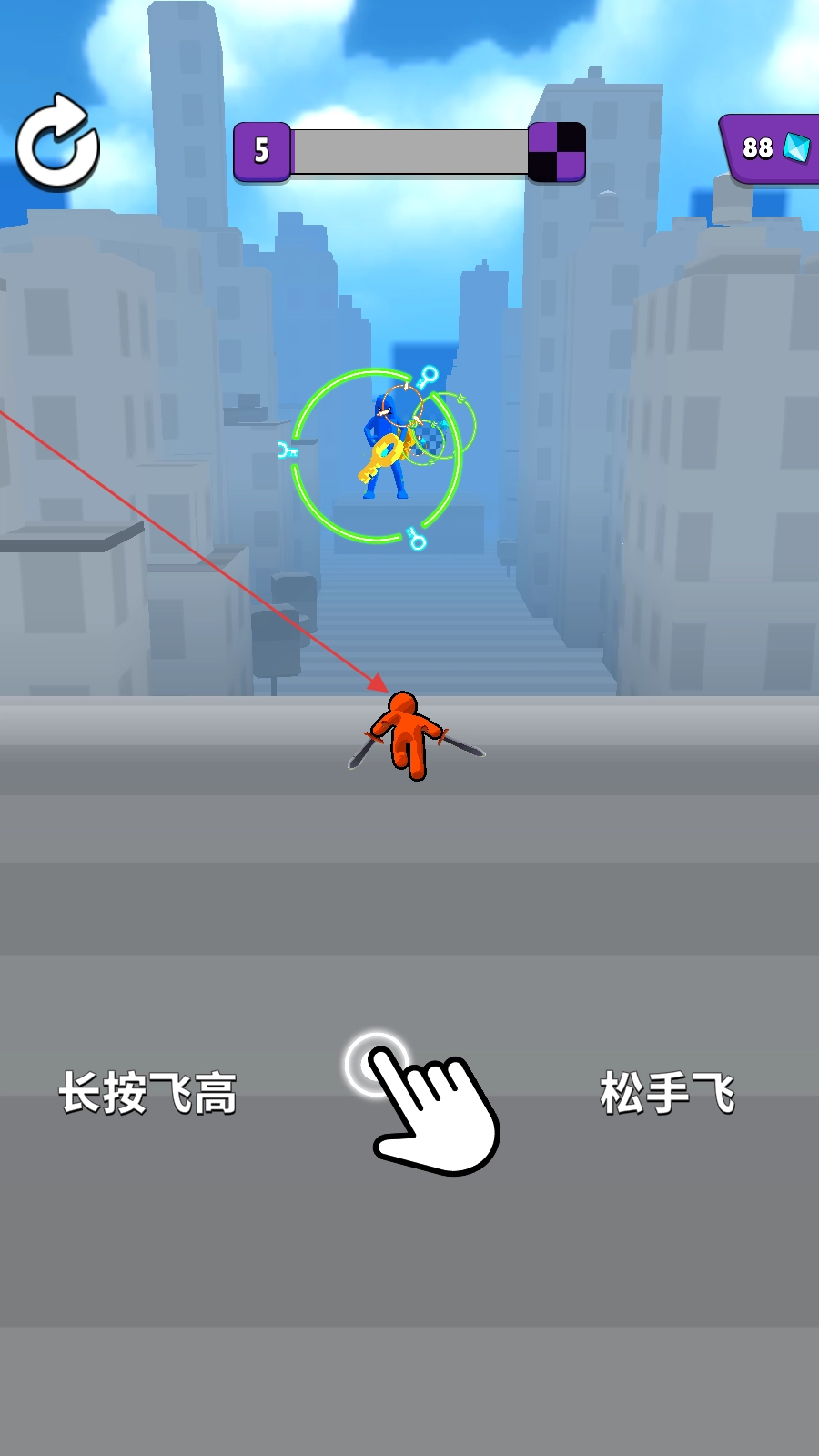 长按可以使角色飞行,精准穿越过圆圈获得钥匙。