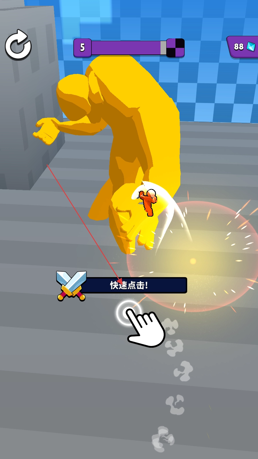 在与巨型敌人交战时,通过快速点击屏幕来触发高频率的攻击输出。