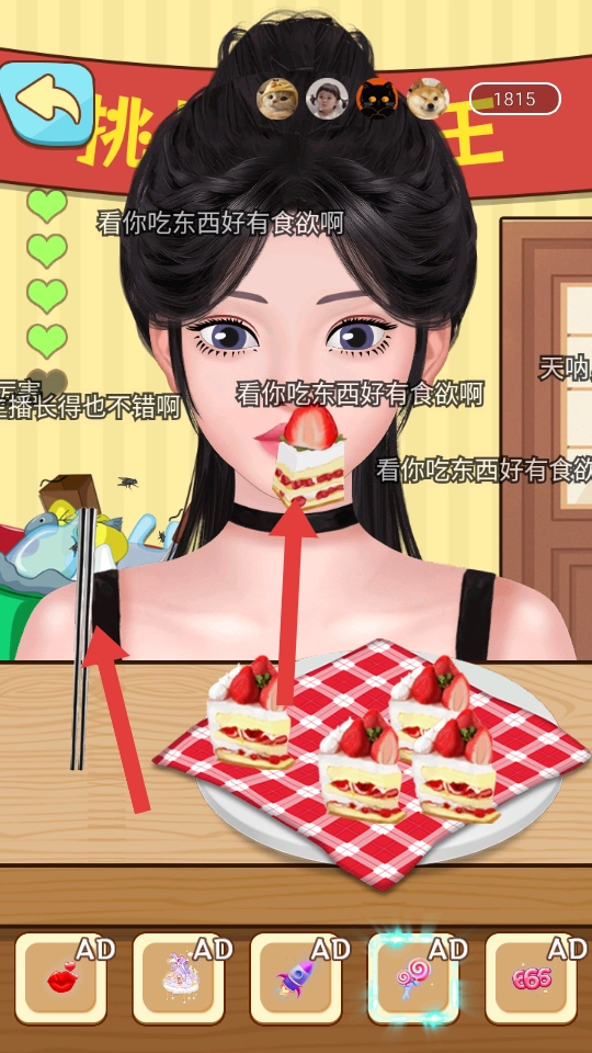 开始享用所选的食物,例如蛋糕,用筷子之类的工具夹起食物送进嘴里,与此同时还能看到屏幕上的互动评论,以此增添游戏的趣味性。