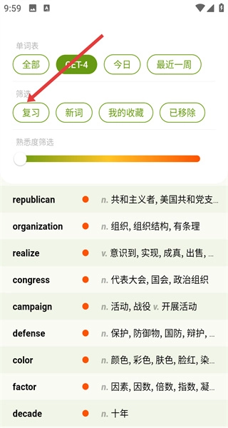 在学习单词的过程中,大家可以点击复习功能选项,这样就能对之前学过的单词进行回顾复习,从而巩固记忆,让自己对单词的印象更加深刻。