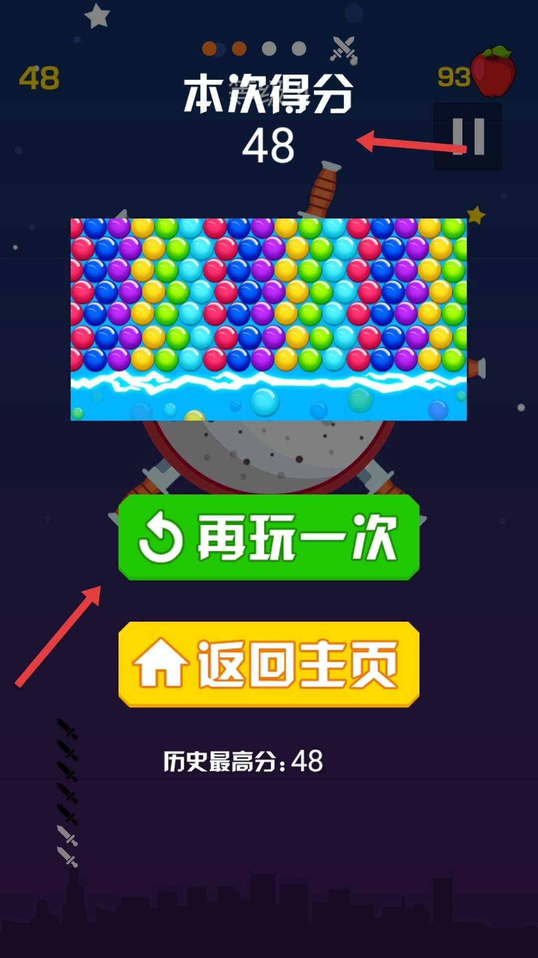 每局游戏结束后,界面会呈现本次的得分情况,同时设有“再玩一次”等功能按钮,玩家可以选择点击“再玩一次”去挑战更高分数,也可以选择返回游戏主页。
