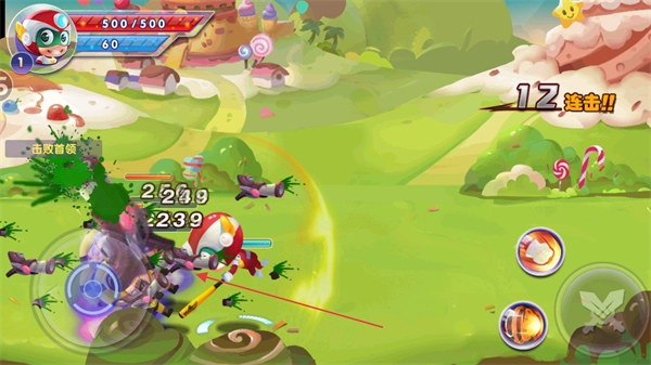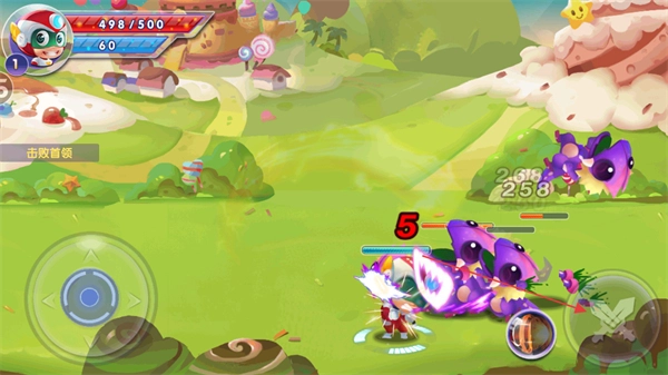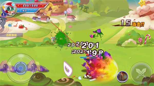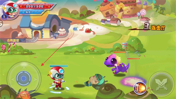 进入游戏后,注意观察屏幕左上角角色的生命值(显示为500/500)和能量值(当前60点),你可以借助左下方的虚拟摇杆来控制开心超人的移动方向。
