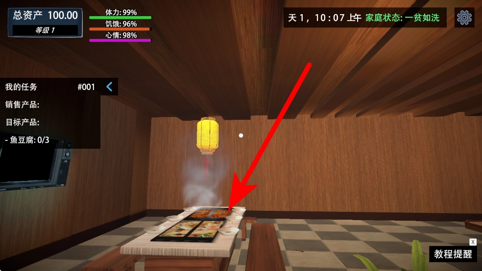 请多留意左侧的销售任务,先把目标产品确定清楚,像鱼豆腐这类产品就是重点;之后通过制作并销售这些目标产品,努力达成任务要求,这样既能提高小店的经营收益,也能让小店的等级得到提升。