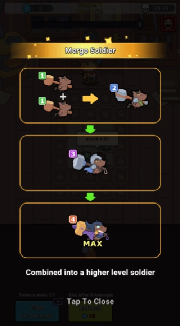 游戏的核心玩法是把两只等级相同的小动物合并起来,从而进化成更厉害、等级更高的动物。
