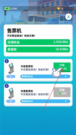点击售票机,花费1.5K资金对其进行升级,以此提高店铺的收益并增加乘客数量。