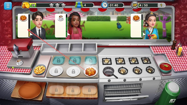 把准备好的餐食递给相应的顾客,以此获得金币,只要在规定时间内达成目标金币数量就能顺利通关。