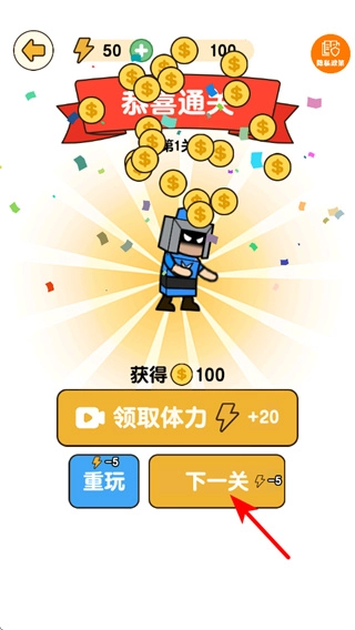 点击“下一关”按钮即可开启新的关卡挑战,在正式进入新关卡之前,你可以先领取本次通关的奖励,比如金币等资源;这些积累起来的资源,能够用于后续提升城堡等级或者解锁更多新功能。