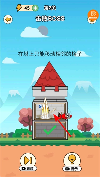 在塔上移动时只能选择相邻的格子,移动时需规划路线,确保能顺利接近BOSS并发起有效攻击。