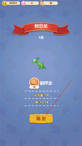 已成功培育出新的恐龙,您可在下方查看该恐龙的详细资料及攻防属性,点击确认按钮即可将其送往公园。