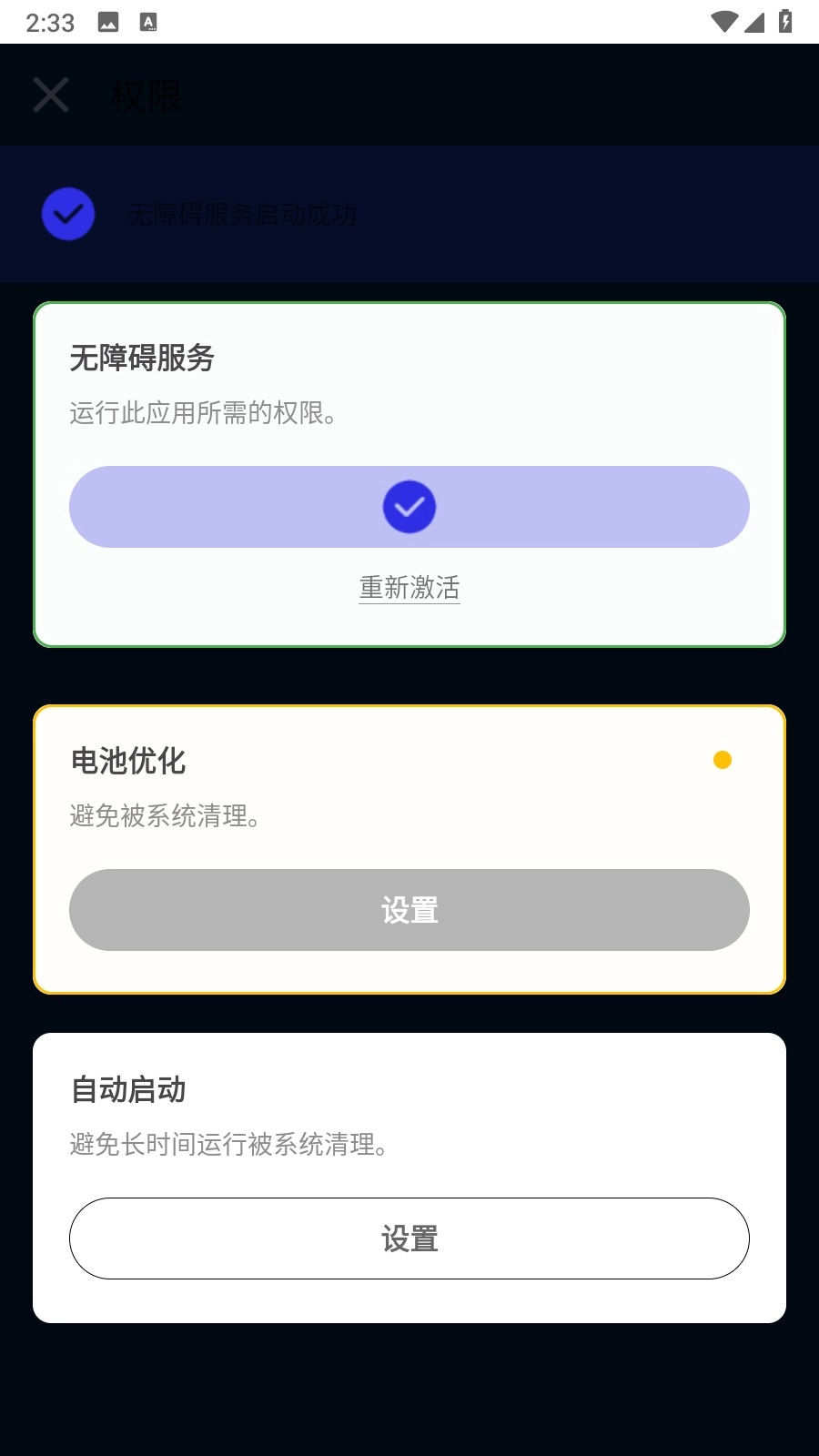 您可以先禁用“无障碍服务”再重新开启,也可以关闭后重新启动应用程序,还可以选择重启设备。