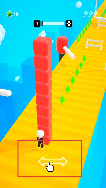 通过左右滑动来调整角色的位置,使红色方块处于角色身前,以此避开障碍。