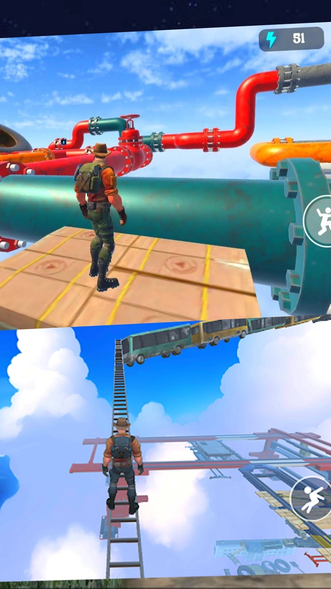 1、采用立体环绕式的高空场景设计,逼真模拟高空跑酷体验,营造出强烈的视觉冲击力;