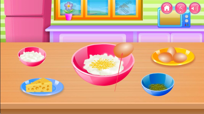 点击鸡蛋并将其打入大碗,与其他食材混合。