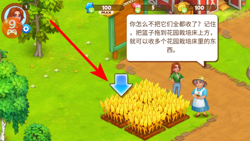 在农场中,面对成熟的作物,按照提示轻按并按住篮子,将其拖到花园栽培床上方,从指定的起始位置开始,就能高效收割多个栽培床里的作物,收集产出。