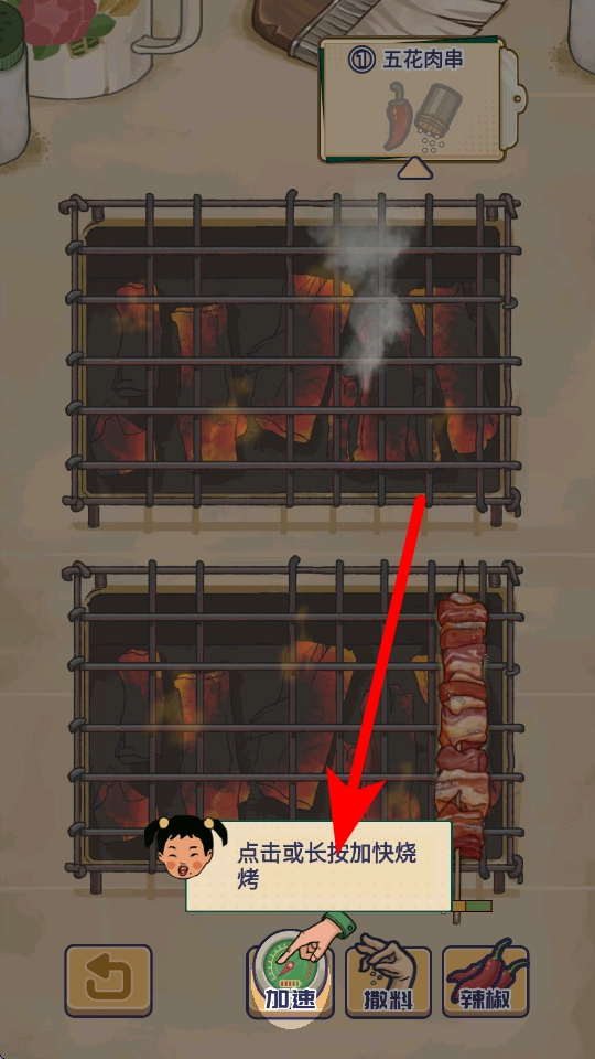 在烧烤制作过程中,您可以点击或者长按加速按钮,以此来加快烧烤的制作进度,这样顾客就能更快品尝到美味的烧烤,进而提升店铺的经营效率,增加收益。