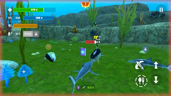 1.玩家将化身为不同类型的鲨鱼,从体型娇小的幼年鲨鱼起步,一步步成长为海洋里的顶级掠食者;