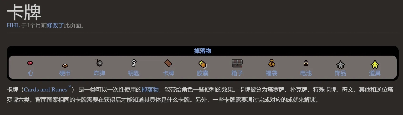 卡牌是游戏里相当关键的一次性掉落道具,捡起来后会占据屏幕右下角的位置,和药丸的使用方式一样,都是按Q键触发。由于游戏中各类卡牌的效果繁杂多样,新手玩家在游玩过程中,建议多去查阅以撒wiki上的卡牌详细说明。另外需要注意的是,多数情况下角色身上只能携带一张卡牌或一颗药丸,二者共用同一个道具栏位置,因此要结合自身实际状况来决定携带哪张卡牌或者哪颗药丸。
