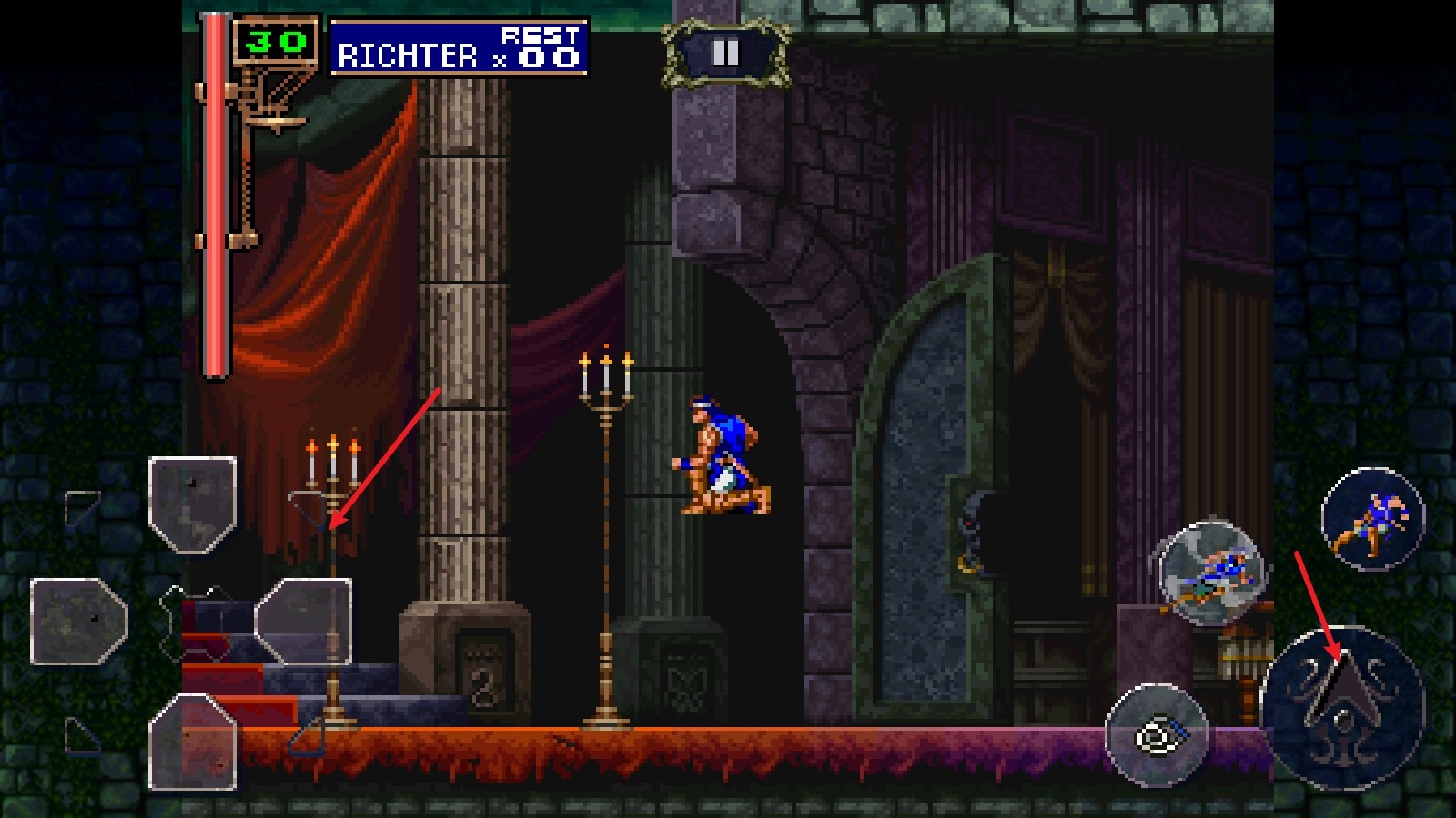 使用RICHTER重新开启这个GAME,在LOADING过程中按住左斜下方向键,等LOADING结束进入GAME后,当城门快要关闭的时候,就快速连续按跳键。如果操作成功,RICHTER就会跳出城门,不过之后无法再进入城门了。