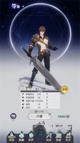 在左下方点击巨剑按钮就能给角色升级,每次升级要消耗的经验值不一样,等等级达到一定程度就可以晋升了。