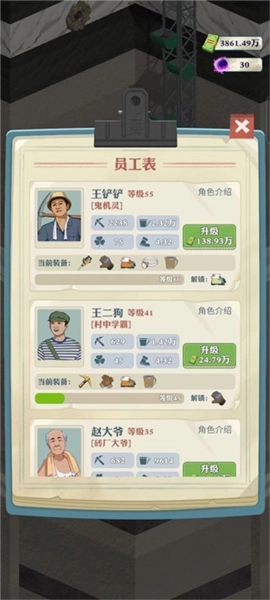 招募到员工后,可通过不断升级解锁新装备,提升各项挖掘力。等级越高,所需金钱越多,因此在金钱有限时,更推荐优先升级消耗金钱较少的员工,这样能更显著地提升挖掘能力,是性价比更高的提升方式。