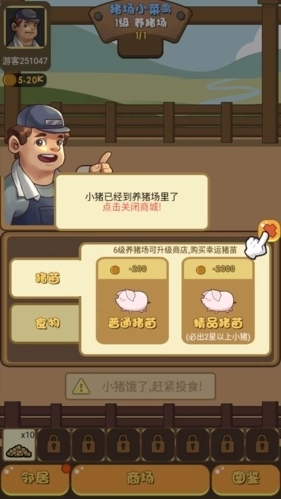 1、你将负责运营自己的猪场,在猪场建设的进程里持续培育小猪,通过合成的方式来提高它们的等级;