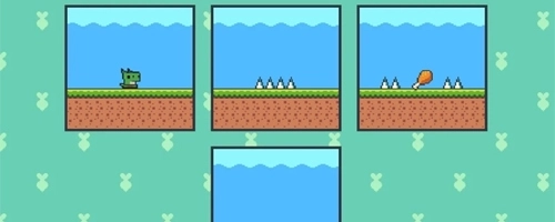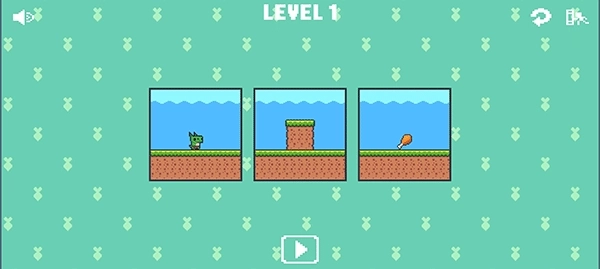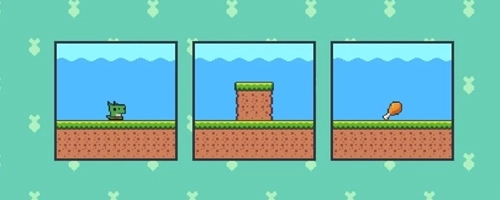 3、进入第一关后,当小恐龙即将走到第一张场景图的边缘时,我们把它和第二张场景图拼接在一起,小恐龙就会进入第二张场景图;当小恐龙走到第二张场景图的边缘时,我们再将第二张与第三张场景图拼接,小恐龙就能成功吃到鸡腿,顺利通过第一关。