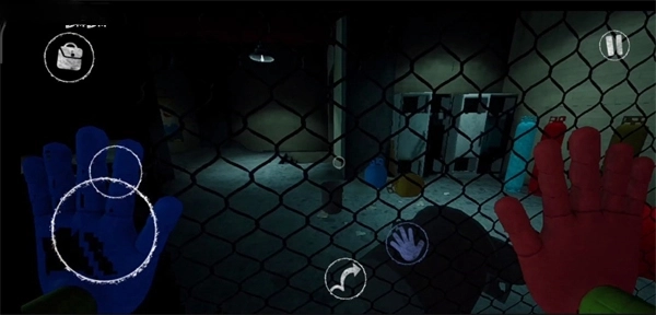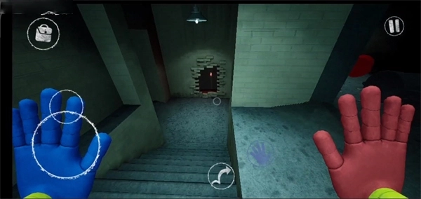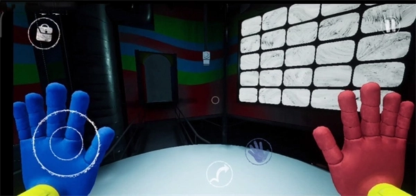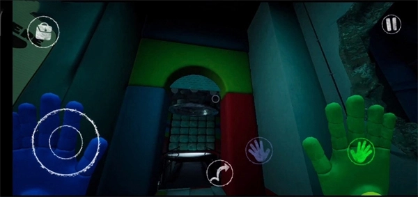 3、从沉睡中苏醒后,发现自己身处一个全然陌生的世界,周遭遍布着各式各样的玩具。界面左下角的按钮能够操控角色进行自由移动,右侧的图标则分别对应角色的左右手掌,主要用于拾取物品,不过当前阶段仅能使用绿色手掌。