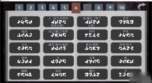 6、人类、人、鬼/幽灵、名字、鬼语、出口/路口/世界、时间、声音、方法、痛苦/难过/难受、意识/理智、形状/样子、身体、头、头发、脸、眼睛、耳朵、嘴巴、手